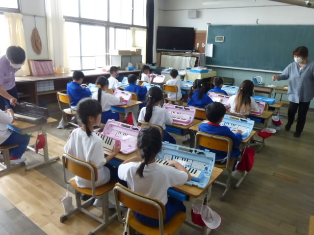2023年5月23日(火) 大きなつぶやき⑯鍵盤ハーモニカに挑戦5月22日(月)に1年生の各教室で鍵盤ハーモニカ講習会が行われました。ヒオキ楽器さんより来ていただいた講師の方は、愉快に、易しく、楽しく、わかりやすく、1年生の集中力を切らさないように、メリハリをつけて指導してくださいました。1年生も初めての鍵盤ハーモニカに興味津々。