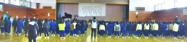 今朝の全校音楽は、卒業式に向けて、在校生と卒業生が分かれて行われました。