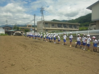 6月22日(月)、畑からトラクターの音が聞こえてきました。授業が終わり、休み時間に畑に行ってみると一面、綺麗になっていました。人の手の大変さ、トラクターの威力を実感した子どもたちです。