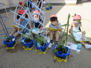 1年生が毎朝、「先生、朝顔咲いたよ!!」と誰かしらが報告してくれます。来週は、花遊びを始めたいと思っています。それまでにたくさん咲くといいですね!!