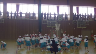 行われました。ラジオ体操、玉入れ(ダンス入り)、校歌ダンスと一時間たっぷりお家の方に見ていただきました。赤組も白組もかごいっぱいに玉が入り一年生といえども大人数のすごさが分かりました。校歌ダンスはなかよし学級の6年生がステージで一緒にお手本として踊ってくれました。練習段階でもお世話になった6年生と一緒の校歌ダンス。これもよい思い出です。111名で入学し3か月が経過した一年生の楽しそうな姿。ご参観ありがとうございました。