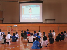 1,2年生は体育館で交通マナーについてのお話を聞きました。