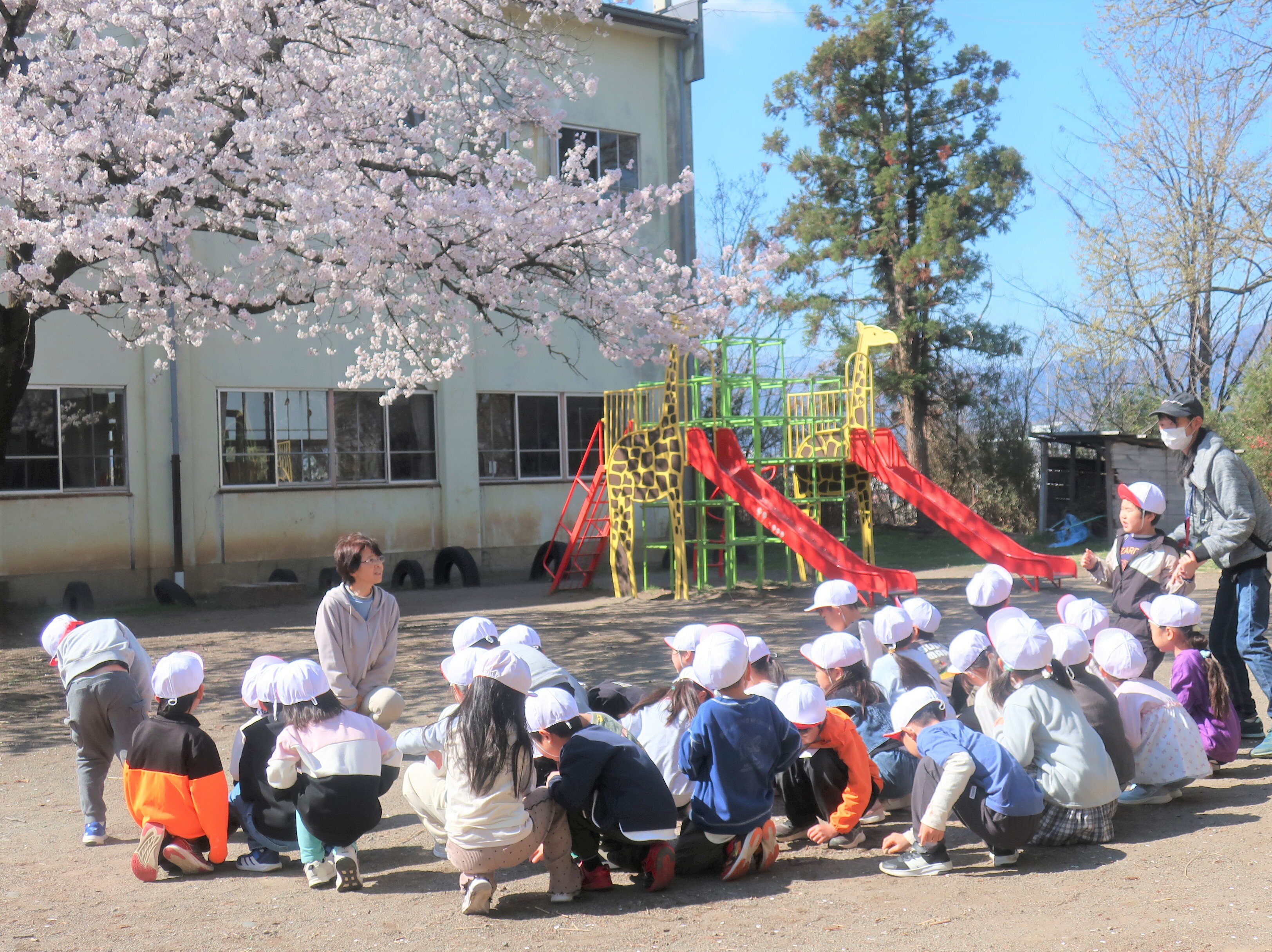 1年生の皆さんが川辺小学校で休み時間に遊べる屋外は、中庭だけです。3組のお友だちが中庭の使い方やルールを先生から教えてもらっていました。