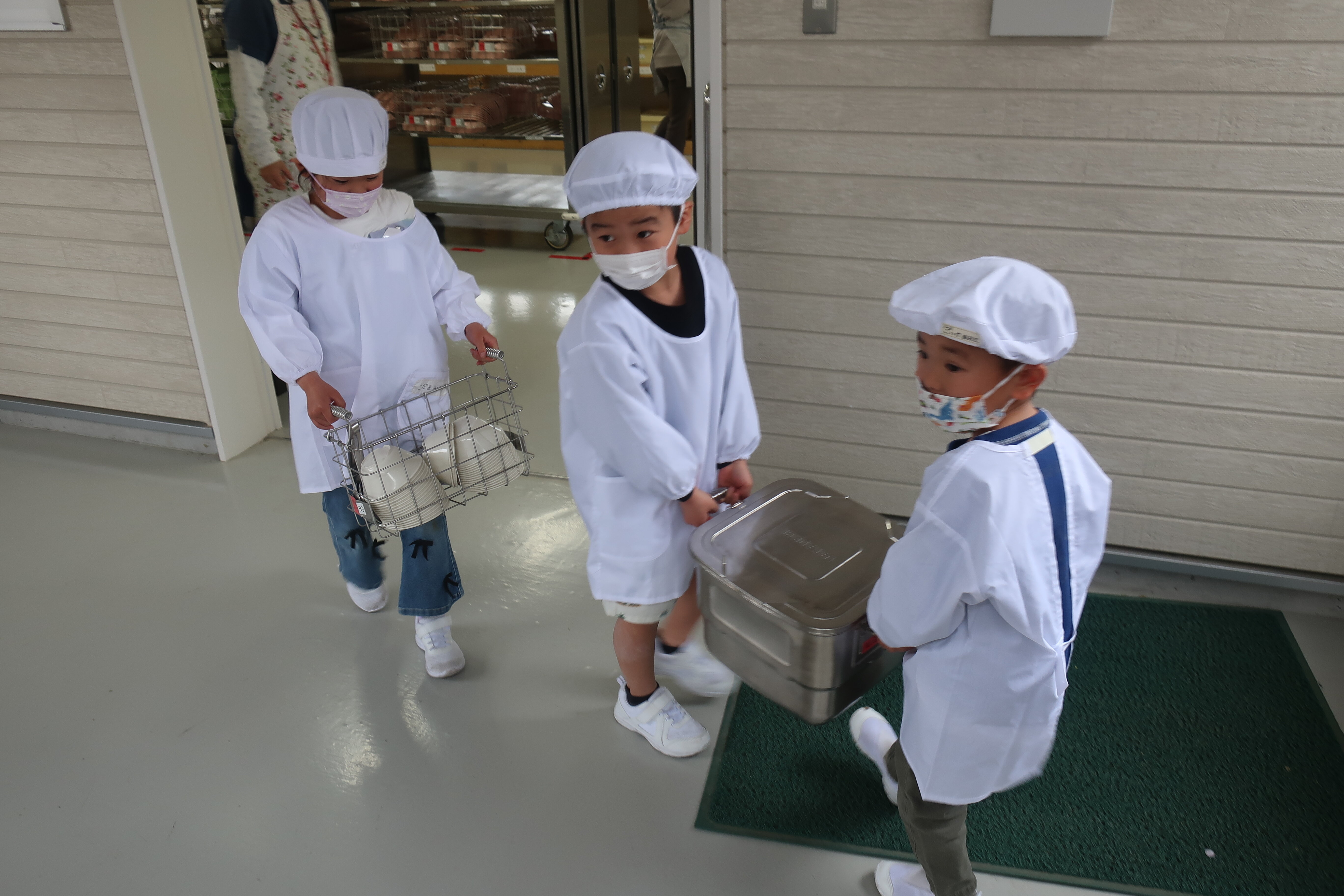 牛乳や食缶等重いものもありますが、お友だちと協力して一生懸命運びます。