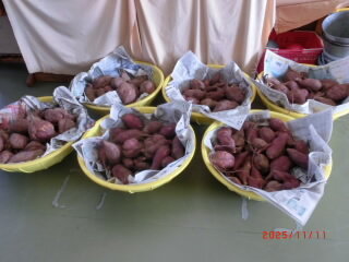 水道前の廊下には収穫されたイモが並んでいます。