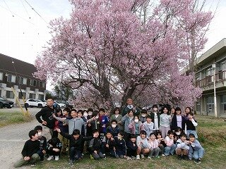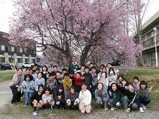駐車場脇の満開の桜の下、始めにクラスごとの撮影をしましたが、私も一緒に入れてもらいました。