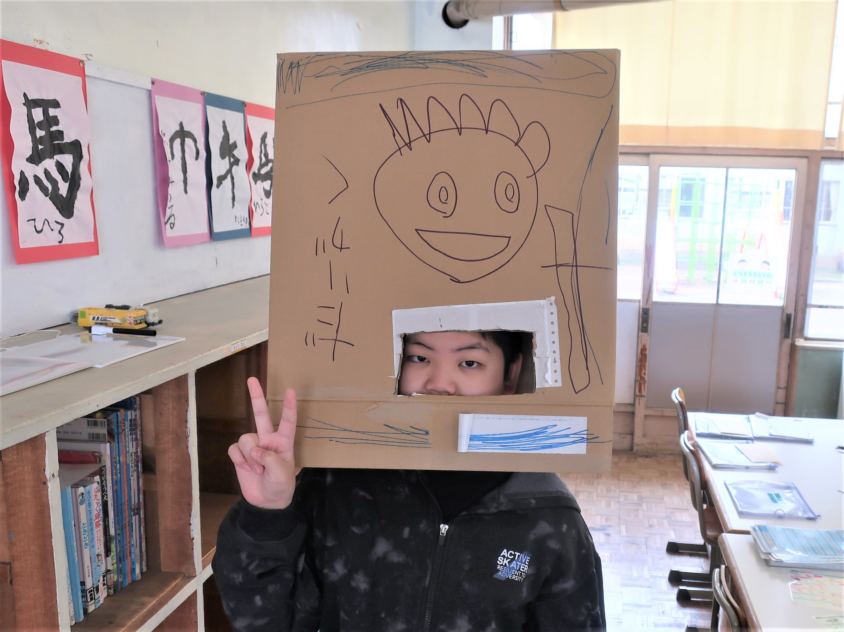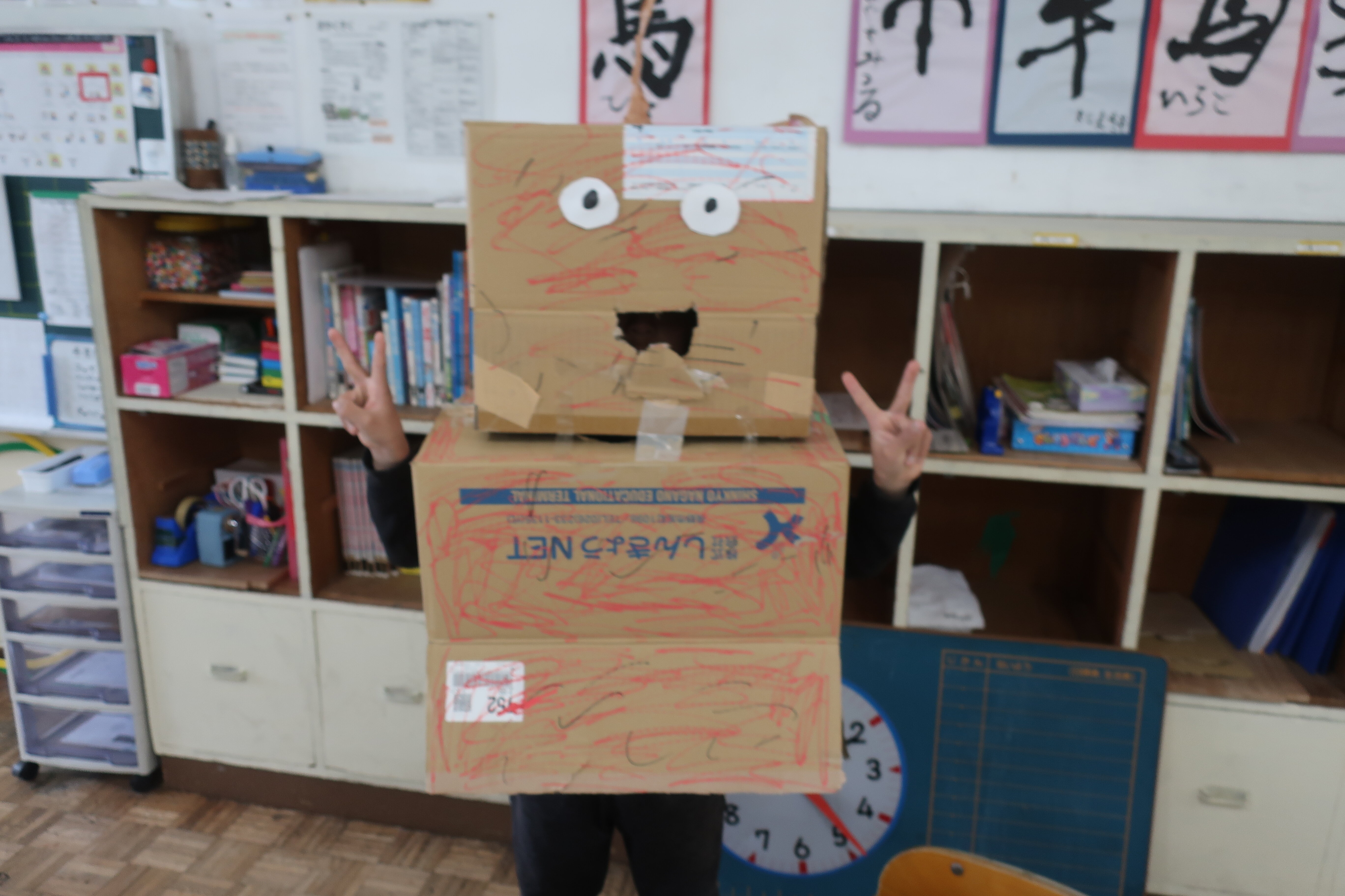 朝、仲よし2組さんの教室におじゃますると、6年生のお友だちが作ったという、被るとロボットやムックに変身できるダンボールの被り物がありました。
