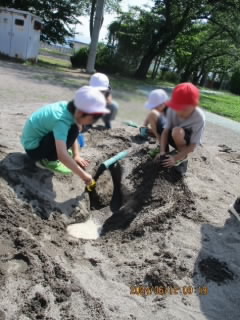 図工の造形遊びで砂場をつかって活動をしました。シャベルなどの道具を使って、砂を掘ったり、ケーキを作ったりしました。最初は、「やりたくない。」と言っていた子もいましたが、砂に触れているうちに夢中になって活動していました。水道から水を汲んできて、川のように流したり、砂を湿らせて型を抜いたりしていました。砂の感触を味わいながら楽しく活動できました。
