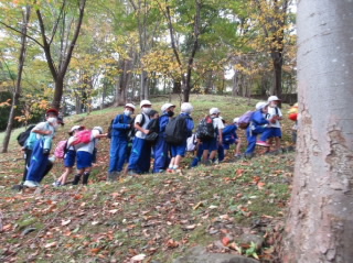 途中の歩道が少し狭いので大人はドキドキでしたが、上手に並んで歩くことができました。最後の山道を経てやっと公園に入り、のびのびと歩くことができました。結構な急斜面でしたが、どんぐりがあったり、栗のイガがあったりで楽しみながら登れました。頂上では上田市が一望でき、気持ちが晴れ晴れしました。来年登る予定の、砥石米山城も見えました。