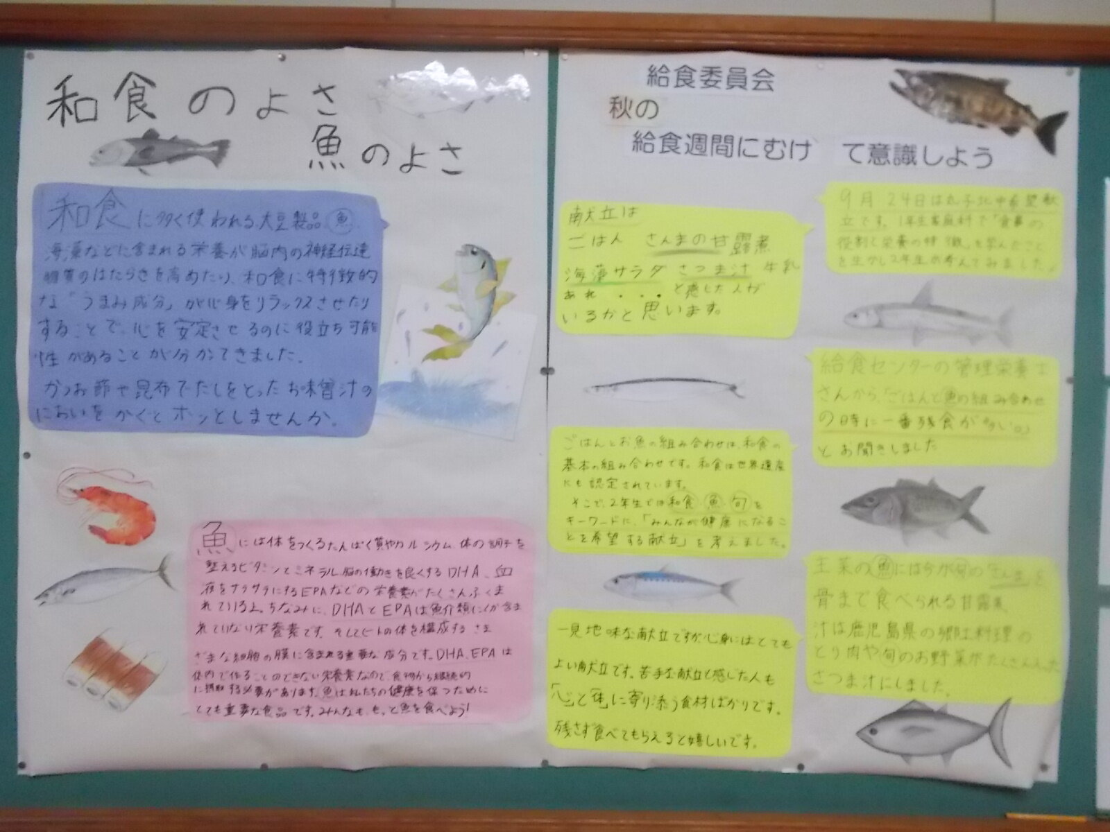 今週、生徒会の企画でいくつかの週間が行われています。給食委員会では「秋の給食週間」を企画し、活動しています。給食や魚にまつわるクイズを放送したり掲示物を作成したりしてくれています。互いに食生活について考え合う機会になりそうです。