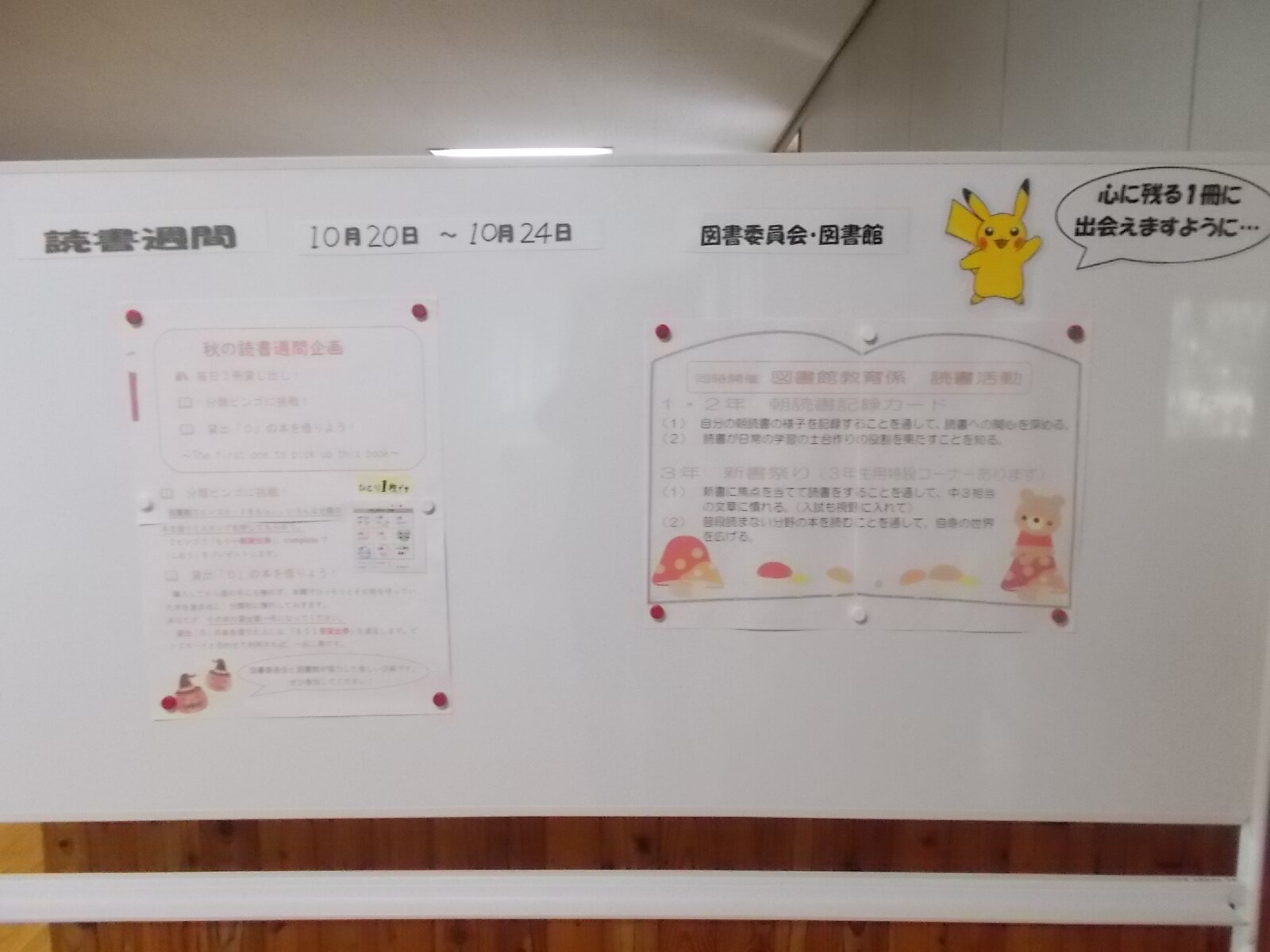 今週、図書委員会で「秋の読書週間」を行っています。本に興味をもってもらったり図書館にたくさんの人に来てもらえるようビンゴカードを用意したりと企画しています。「読書の秋」と言われるように、過ごしやすく長い夜の間にたくさん本を読めるといいですね。
