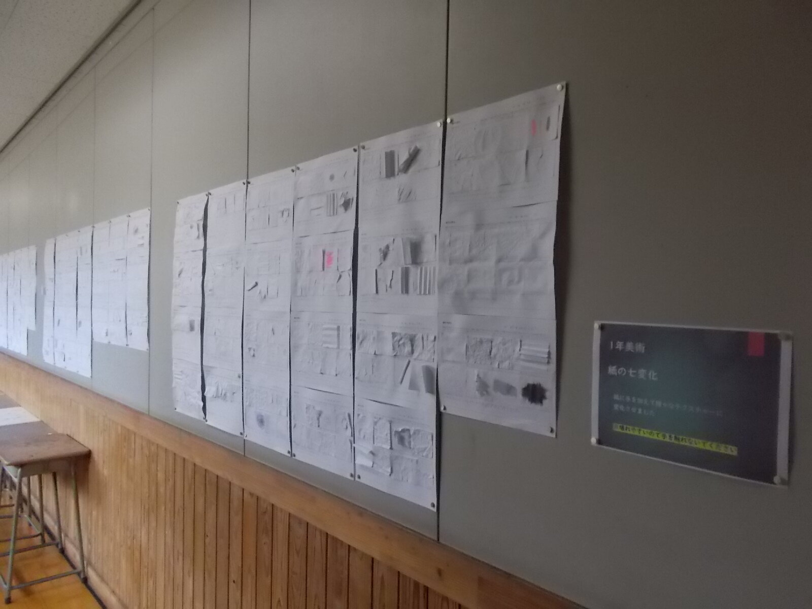 南校舎2階廊下には、1年生の作品で「紙の七変化」と題し、紙に手を加えて様々なテクスチャーに変化させた作品となっています。それぞれアイディアや工夫が施されています。