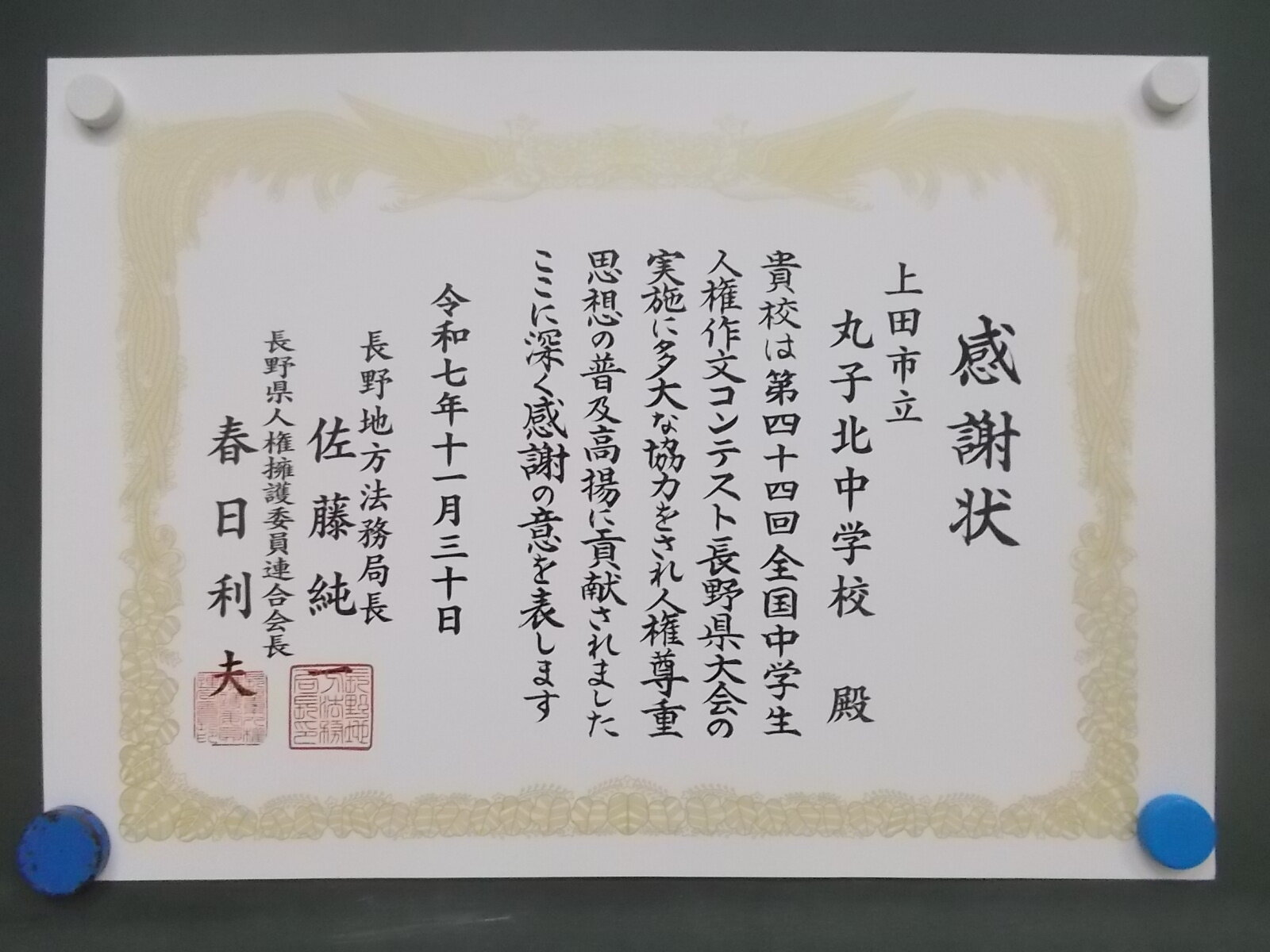 昨日の税の標語の表彰に続き、人権作文への感謝状も届きました。今年度も学校の人権教育で学んだことや、学校生活や日常生活の中で感じた人権尊重の必要性について伝えられた生徒が多くいました。