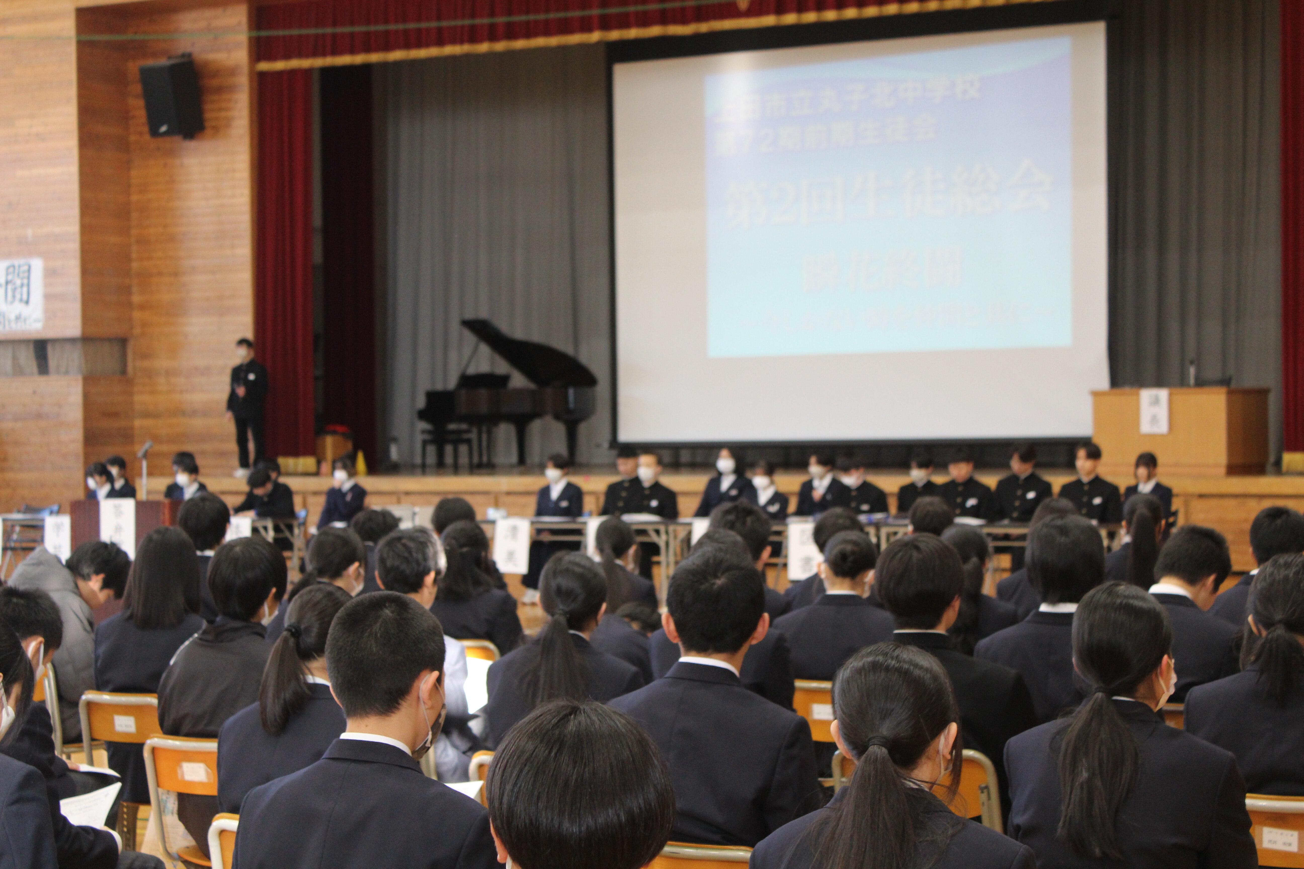 本日、第2回生徒総会が行われました。来年度に向けて多くの意見が出されました。今年度の役員をはじめ、3年生は今まで全校の中心となって生徒会活動に取り組み、引っ張っていってくれました。全校のため、学校のため力を発揮してくれて本当にありがとうございました。また、これから2年生が全校を引っ張っていきますが、さらにより良い丸子北中を目指していってほしいと思います。