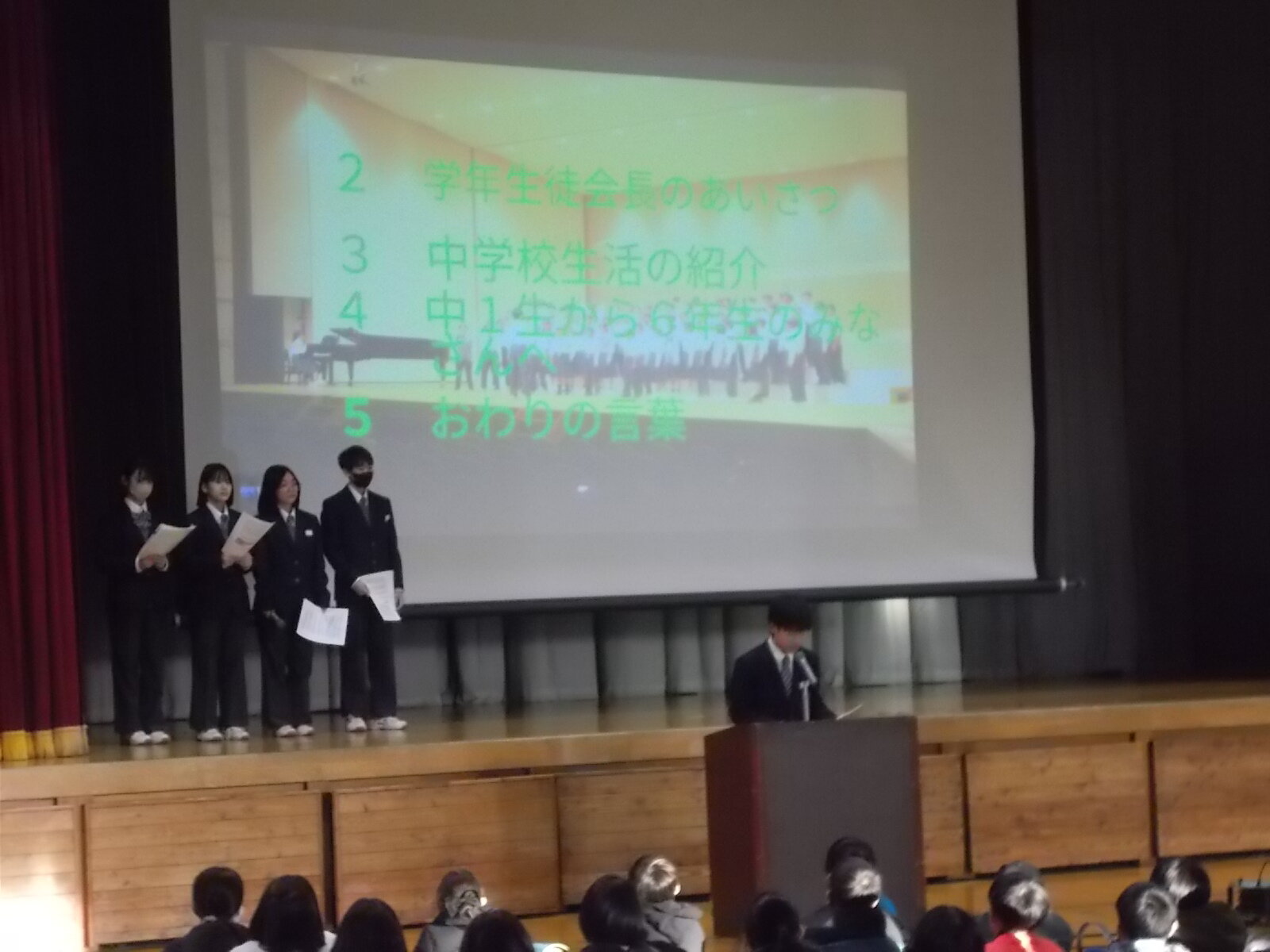 また、中学校生活については、1年生の学年生徒会の皆さんが説明をしてくれました。先輩として堂々と発表することができていました。