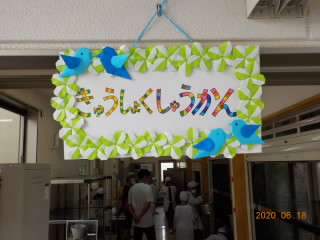給食室の入り口には、「きゅうしょくしゅうかん」という手作りの看板が掛かっています。18日は語呂合せで「いいは」のひの献立でした。