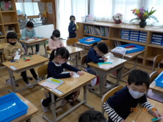 ランドセルから荷物を出し、色別に分かれたケースに連絡帳などを提出します。ランドセルは自分のロッカーに向きを揃えて入れます。ここまでできたら、「絵を描く」「本を読む」「折り紙をやる」など、自分のやりたいことを始めます。折り紙の折り方を教える子、描いた絵を見せ合う子。やるべきことがしっかりできて、すばらしです。