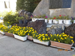 校庭のサルビア、アゲラータムも、鮮やかに赤や紫の色が咲き誇っています。