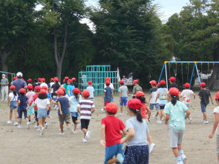 みんな,ハンカチを口に当てすばやく校庭に避難をします。