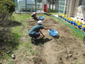2022年4月22日(金) 学級園の整備 2年生1年生と2年生の教室のとなりには、学級園があります。 お掃除の時間、2年生のお友だちが、担任の先生と一緒に、整備しています。 太陽がギラギラ輝いて、とっても暑い中ですが、黙って集中して、一生懸命草取りをしています。