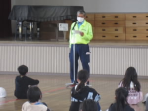 5,6年のお友だちの交通安全教室は、例年と内容を変えて学年ごとに、警察の方と安全協会の方から、お話をお聴きしました。