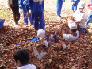 集めた落ち葉を一カ所に集めると、落ち葉の山ができました。その中に、みんな飛び込みます。