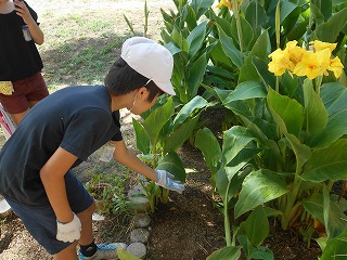 校内にキレイに咲いているカンナは4年生が一生懸命にお世話をしています。 外の作業なので、朝の時間に水筒を持ちこまめな水分補給をしながら作業をします。