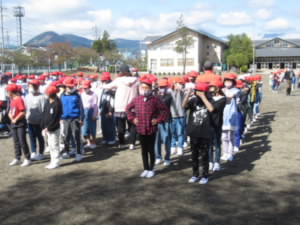 校長先生から訓練についての大切なお話を聴いた後、コロナ感染防止対策として密を防ぐために、前半に2、3、5年生が避難、後半に1、2、6年生が避難しました。
