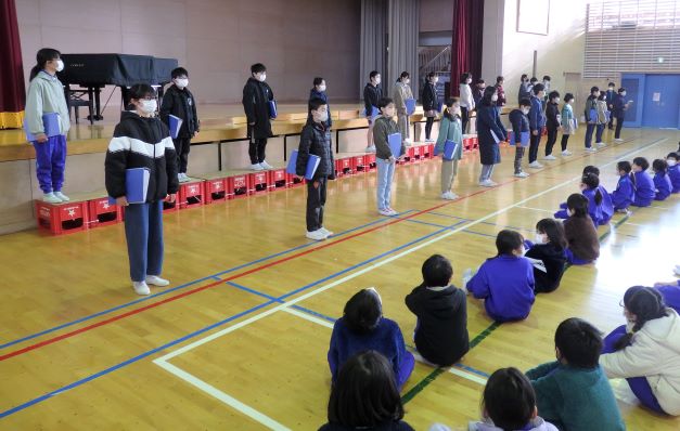 2月7日の朝、児童集会で5年生の新児童会役員が紹介されました。その後6年生の役員から各委員会のファイルが引き継がれました。新役員の皆さん、よろしくお願いします。
