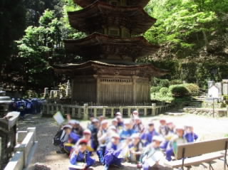 最初の目的地「安楽寺」では、八角三重の塔を見学しました。「1290年に建てられたそうです。」「長野県の国宝第一号だそうです。」と、解説を読んだり八角三重の塔をスケッチしたりしました。次の目的地「北向き観音」では、広い敷地内にある観音堂や鐘撞堂を見学したりスケッチしたりしました。このころになるとお弁当が待ち遠しくなり、「先生、お弁当はどこで食べますか。」「お昼はまだですか。」と声が聞かれるようになりました。そして、最後の目的地「あいそめの湯」に到着すると早速お弁当をいただきました。帰りの電車は貸し切りではなく一般の人たちと一緒の乗車になりましたが、マナーよく過ごすことができていました。