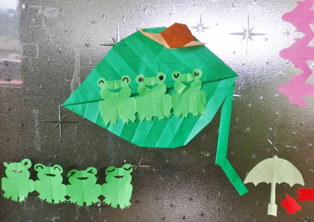 心の相談室入り口に子どもたちの折り紙作品が掲示されています。梅雨明けはまだかな?