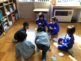1・2年生はこの日のためにオリジナルカルタをつくりまました。あるグループは「ポケモンカルタ」をやっていました。ポケモンは来入児さんと1・2年生の共通文化です。ポケモンのキャラクターを探しながら楽しむ様子がありました。あるグループは「なかよしカルタ」です。友達同士なかよく活動している場面をカルタにしました。学校生活の紹介にもなりますね。その他昆虫カルタなど工夫したカルタで楽しみました。