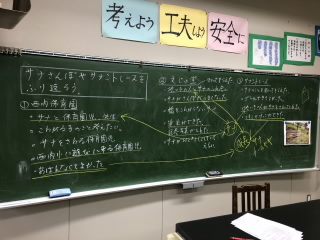 黒板の記録を見ながら、試しの散歩やサナ散歩、サナントレースで共通していることや大事なことは何か話し合いました。