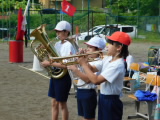 今年の開会式は、ファンファーレもありました。総合的な学習の時間の金管チームの取り組みです。曲は先生の作曲です。