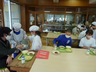 給食当番は、丁寧に盛り付けてくれるし2年生もしっかり活躍。おかわりジャンケンは毎日盛り上がっています。