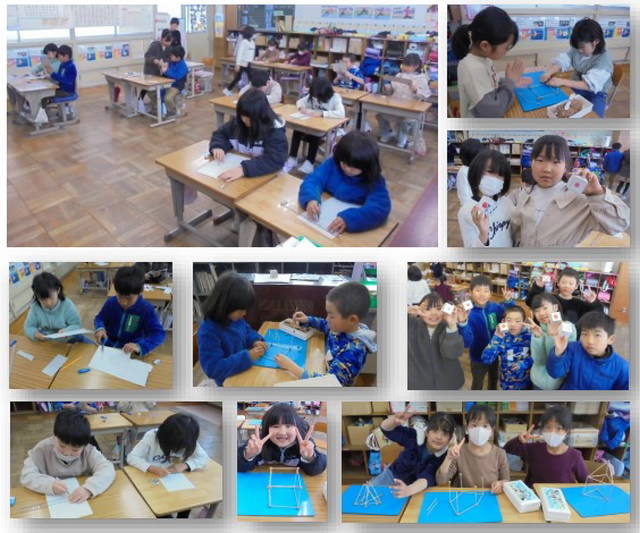 2024年2月28日(水) 算数「はこの形」(2年)算数で、「はこの形」の学習をしています。直方体や立方体を実際に作って、面の数や辺の数、頂点の数を調べてきました。直方体は、雛飾りの台に、立方体はサイコロにして、生活科や図工ともコラボレーションしています。