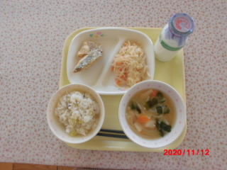 さつま芋ご飯、あじの竜田揚げ、春雨サラダ、麩の味噌汁