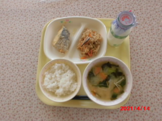 ご飯、鰆(さわら)のレモンソースがけ、切干大根煮、青菜の味噌汁