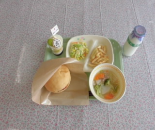 【献立】・太郎ポークハンバーガー ・コーンスローサラダ ・長小産じゃがいものフライドポテト ・ポトフ ・牛乳 ・シャインマスカットパフェ