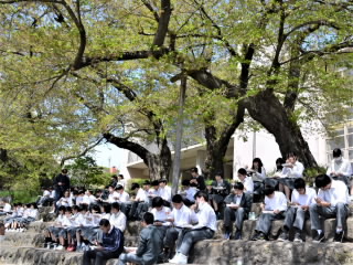 桜の花はすっかり散ってしまっていましたが、本日の給食は全校が外で給食をいただきました。