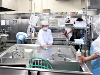 1学年の食育の授業の様子です。栄養職員の先生から給食についてのお話を聞いたり、調理員さんと給食室で洗浄体験を行ったりしました。