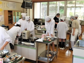 地域の特性や歴史と郷土食の関係について探究しているグループが、地域の方を講師に招き、おやきづくりをしていました