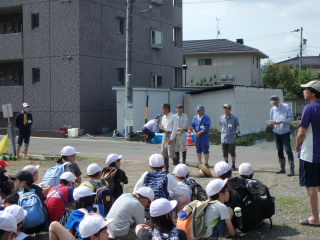 西小5年生と一緒に晴天の下での田植え。アドバイザーさんから説明を聞いて、初めての田植えにチャレンジ。恐る恐る田んぼに足を入れると、水の冷たさと泥の感触に思わず声が出ます。
