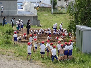 きょうは、少しでも涼しいうちにと、1時間目に、1,2,3年生が協力して「サツマイモ」の苗植え付けをしました。