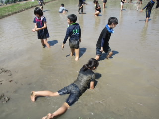 今日は、裏の学校田で、4年生が泥んこ遊びをしました。