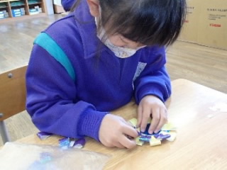 もうすぐお世話になった6年生のお兄さん、お姉さんともお別れです。今週は、6年生に感謝の気持ちを込めたメダルが完成しました。メダルの色を選ぶ時には、「じこしょうかいのときに、むらさきがすきっていっていたから、むらさきにしようかな。」「このいろが、にあいそう。」などと言いながら、6年生のことを思い浮かべていました。折り紙で折ったメダルの周りに、花びらのようなひらひらした紙をつけました。思い思いに色を選び、すてきなメダルが完成しました。メダルの裏には、6年生に向けた温かいメッセージを書きました。世界に一つだけのメダルです。きっと、6年生も喜んでくれることと思います。