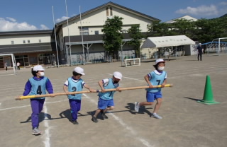 短距離走では去年より少しだけ長い距離を走ります。体育発表会まで何度も走り込み、少しでも体力をつけていきたいと思います。台風の目では、赤と白に分かれ、4人1チームで竹を持って走り、コーンを2つ回ります。「いかにコンパクトにコーンをまわるか」そこが大事です。結果がよめないところが面白いです。子どもたちの白熱した戦いを楽しみにしていてください。