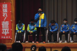 県中スキー大会で好成績を収めて全中スキー大会出場を決めた3名の選手の壮行会が行われました。