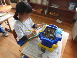 真剣に説明を聞き、こぼさないように丁寧に、間違えないように慎重に自分の植木鉢を作りました。最後に『いつ芽を出すか』みんなで予想しました。「毎日観察してね!」の約束をし、期待に胸を膨らませる授業となりました。