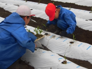 小学校全校でとうもろこしの苗植えをしました。苗の数は全部で4千強です。計算すると一人80本あまりを植えたことになります。雨の後のぬかるんだ畑で泥だらけになってがんばった子どもたちでした。